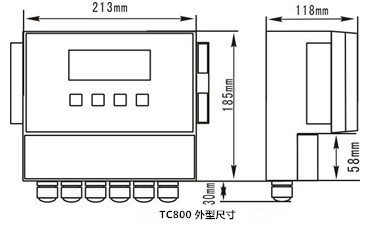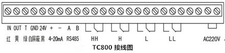 TC800分體壁掛式圖形超聲波液(物)位計(jì)安裝尺寸圖及接線圖。